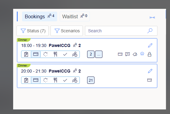 A booking that has applied a payment option, will show with status “Confirmed” in the booking app. Additionally, the credit card symbol indicates a payment related to this booking.